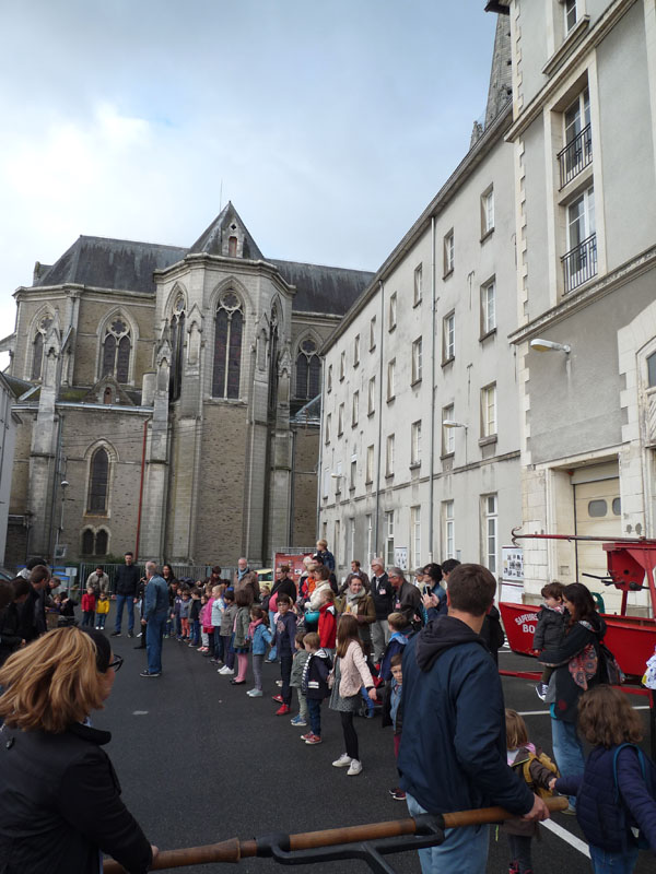 Petits et grands font la chaine pour alimenter en eau la pompe à bras comme " à l'époque"
